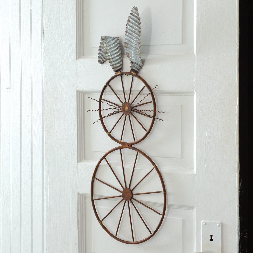 Hang this farmhouse bunny wheel on a wall for a touch of spring or Easter whimsy. It features two small wagon wheels, forming its body and galvanized ears and whiskers.